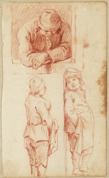 Editor: This drawing, "An Artist Painting a Portrait of a Woman and Child," attributed to a follower of Chardin, is quite charming. The use of red chalk gives it a warm, intimate feeling. What do you see in this piece, beyond the surface representation? Curator: It's tempting to view this as a simple domestic scene, but let's consider the power dynamics inherent in portraiture, especially in the 18th century. Who had the means to commission such a work, and what message were they trying to convey about their family and status? The artist, seemingly included, further complicates this. Editor: So, you're suggesting it's less about capturing a moment and more about constructing an image? Curator: Precisely. And what does it mean for a male artist to depict himself alongside his wife and child? Is it a claim to domesticity, a performance of patriarchal values, or perhaps something more subversive? What do *you* think? Editor: I hadn't considered the performative aspect so directly. It's fascinating to think about how even seemingly candid depictions can be so carefully constructed. Curator: Absolutely, remembering to examine the socio-political context of art is key.