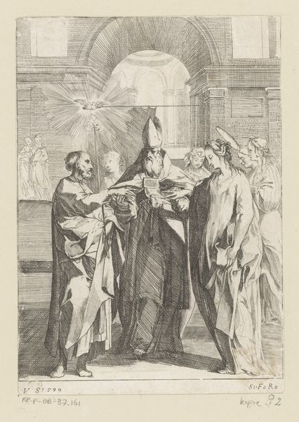 Giovanni Marco Pitteri’s print captures ‘The Sacrament of Baptism,’ rich with symbols echoing through time. The most prominent is water, the cleansing agent poured over the infant’s head. Water as a symbol of purification predates Christianity, found in ancient rituals across cultures, from the Mesopotamian washing rites to the Egyptian ablutions in the Nile. This act speaks to our collective subconscious desire for renewal and purity, a symbolic washing away of past transgressions, or in this context, original sin. Above the baptismal font, we see a statue of a boy with a dove. The dove in Christianity often symbolizes peace, purity, and the Holy Spirit. However, the boy is more reminiscent of classical depictions of Cupid or Eros. This blending of Christian and classical elements, a phenomenon I call "Nachleben," reveals how ancient symbols are reborn and adapted in new contexts, their emotional power enduring across millennia. Consider how this simple act of washing, imbued with layers of meaning, taps into our deepest fears and hopes, connecting us to a timeless drama of spiritual cleansing and rebirth. This cyclical journey of symbols reflects the ongoing dialogue between past and present, a testament to the enduring power of images.
