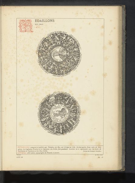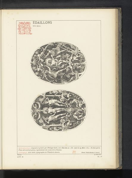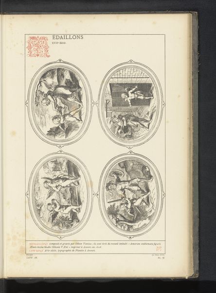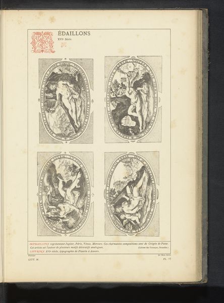 Curator: Take a look at this page from what appears to be an old book; it features an engraving titled "Reproductie van een prent van vier medaillons van de vier elementen door Crispijn van de Passe I," created before 1880. At first glance, what do you notice? Editor: The meticulous detail work is absolutely arresting; the whole arrangement looks like intricate clockwork or fantastical coins recovered from an ancient, submerged civilization. It also looks somewhat fragile and old. Curator: Yes, the engraving process lends itself to such sharp detail. This is, in essence, a reproduction of an earlier print, and each of the four medallions depicts one of the four classical elements: earth, air, fire, and water. Van de Passe, as an engraver and printmaker, skillfully uses line and shadow to bring them to life. Editor: And to underscore that point, this would have been an intensely material process: the crafting of the metal plate, the laborious act of cutting lines into it to hold the ink. Every stage dependent on very specific expertise and physical craft. I love imagining the workshop setting—the smell of inks, the press—really a collective endeavor. Curator: Absolutely, and let's also reflect on the broader societal and symbolic context that the artwork emerges from. Think about the relationship between classical learning and craft traditions, for instance; the popularity of allegorical imagery; and perhaps even alchemical ideas swirling at that time. All this information gives our understanding layers. The artist's voice is subtly present and that gives me the feeling of the connection between people and culture. Editor: That’s right, while seemingly esoteric or “high-art,” each stage in making these prints involves intensely physical labor. From mining to processing the materials, engraving the plates, mixing inks. That labor connects directly with both land and environment. What looks delicate now had tough origins. Curator: I think looking at it from both directions—from the conceptual and historical standpoint and also through this intensely tactile, material process—helps us truly appreciate the skill and depth embedded within this reproduction. Editor: Precisely, it shifts the focus from purely aesthetic appreciation to recognizing the many invisible hands—and raw resources—that make even the most refined artwork possible.