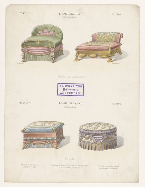 This print by Léon Laroche, presents a canapé, armchair, and chair adorned with lavish fabrics. Note the recurring motif of draped fabric, resembling a theatrical curtain. Such drapery is not merely decorative; it carries echoes of ancient Roman and Greek theaters, signaling importance. Recall how royalty were framed in tapestries in medieval art. The fabric is not just material but a cultural signifier, promising spectacle and luxury. Consider how the motif has evolved through history. From the sacred canopies in religious paintings to the draped portraits of Renaissance nobles, the curtain motif reappears, each time subtly shifting in meaning, yet always hinting at something grand or hidden. Here, the curtain transforms ordinary furniture into a stage for domestic life, evoking a sense of bourgeois theater, highlighting the emotional and psychological desire to elevate the mundane. These motifs, deeply ingrained in our collective memory, re-emerge in new forms, showing the cyclical journey of symbols across time and culture.