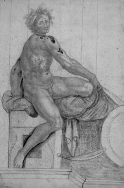 Curator: Here we have Albrecht Dürer’s “Seated Nude Child,” a pencil drawing from 1506. Dürer, as a pivotal figure of the Northern Renaissance, consistently engaged with the human form and its representation within the socio-political context of his time. Editor: Oh, he’s chubby! This little guy just screams awkward innocence to me. Look at that squished little fist near his face, like he's contemplating something really heavy...probably whether to grab another pastry. Curator: Well, you touch on an interesting aspect. During the Renaissance, childhood was often idealized, or used to signify innocence, divine blessing, or potential for moral development. Dürer, however, gives us this unflinching gaze, a certain physical weight, and detailed—almost scientific—rendering of infant anatomy. Editor: Scientific? I just see folds and rolls that demand to be tickled! But, yes, there's something strangely knowing about his eyes, a worldliness you wouldn't expect. And is he holding some kind of pointer, like a tiny conductor about to lead an orchestra of cherubs? Curator: What he’s holding may hint at Dürer’s deeper concerns: in 1506, he had only just travelled back from Italy, and he inscribed this work in the top center with the year and his monogram. The object the child holds seems related to drawing, or pointing, thus revealing some meta-commentary by Durer about the process of its production and a demonstration of artistic virtuosity that places him, competitively, in line with Italian masters. Editor: Ooh, meta! It's like he's saying, "Hey Michelangelo, check out my baby AND my drawing skills!" All kidding aside, the precision in his work, especially the way he captures light on the child's skin, is incredible, even haunting. The softness of his rendering adds an uncanny, surreal element when juxtaposed with the heavy figure and intense gaze. Curator: Precisely. The Northern Renaissance wrestled with different ideals than its Italian counterpart; where Italy was often reaching toward idealized beauty, artists north of the Alps frequently pursued detailed realism, as a reflection of the material and spiritual world that served more specific social functions in its emphasis. Dürer occupies an intriguing space, here showcasing a naturalism not to portray what “should” be, but, rather, what simply is, including the sometimes unflattering reality of childhood. Editor: Well, Dürer definitely gave us something to chew on... or maybe nibble on, like those adorable baby rolls. Curator: Indeed. It invites us to reconsider the construction of childhood—and its intersection with artistry—across time and cultures.