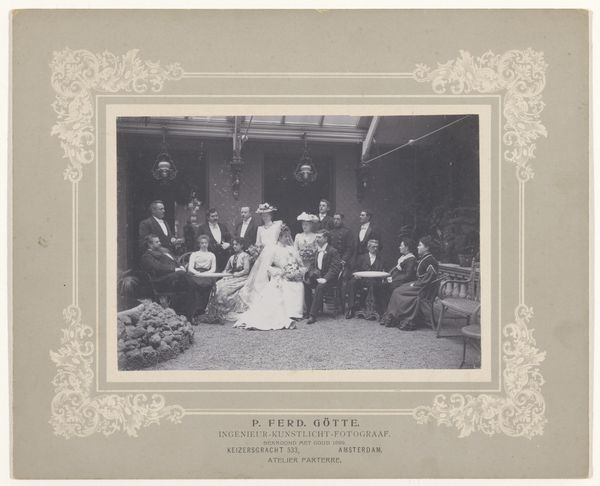Editor: Here we have Nicolaas Schuitvlot’s photograph, “Huwelijkportret van A.H. Crone en C. Müseler…", potentially from 1914. It's a formal wedding portrait taken amidst paintings. I'm immediately struck by the floral arrangements—they're so central, almost as important as the couple! What stands out to you in this image? Curator: The prominence of the flowers absolutely catches my eye, too. It speaks volumes about the cultural significance we place on rituals of renewal. Think about it—flowers are ephemeral, a potent symbol of beauty and life's fleeting nature. Notice how they're strategically placed in front of artworks. Could the artist be commenting on the artifice of both—the constructed nature of art and of social rituals? Editor: That's a fascinating point. So you see a kind of…constructed reality being presented here? Beyond the aesthetic of it? Curator: Precisely. This photograph, styled in Pictorialism, is more than just a record of an event. The soft focus, the staged composition, the carefully arranged floral displays... They all point to a deliberate crafting of an ideal, almost a visual declaration of aspirations. The setting too—surrounded by paintings—places this union within a cultural narrative. Is this a wedding or a stage set for a play about marriage? Editor: I hadn't considered the paintings themselves as part of the message! They definitely add a layer of meaning about status and taste. I guess I saw them more as background detail. Curator: Consider how cultural memory is created through these images. Wedding photos are rarely just for the couple; they become family heirlooms, markers of lineage, conveying values across generations. Editor: So much symbolism packed into one image. I see now that it's less about simply capturing a moment and more about actively shaping its meaning. Curator: Indeed. It leaves me pondering what future generations might glean from our carefully curated images of today. A valuable lens for reflecting on both our history and present-day culture.