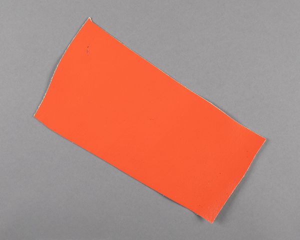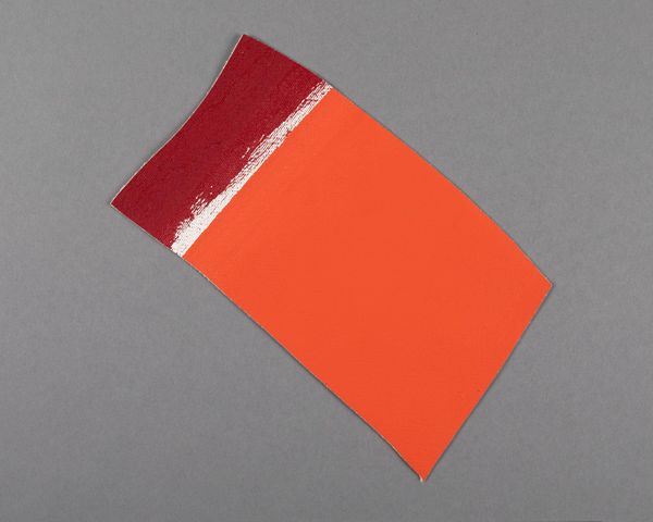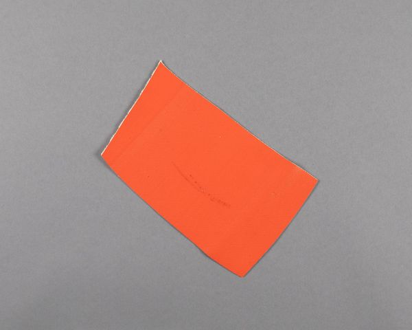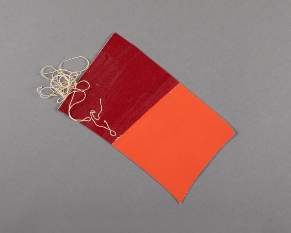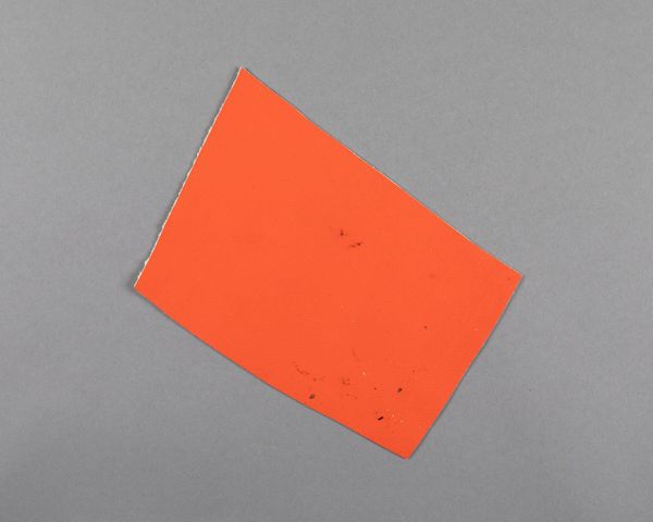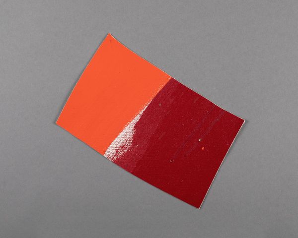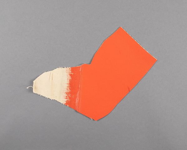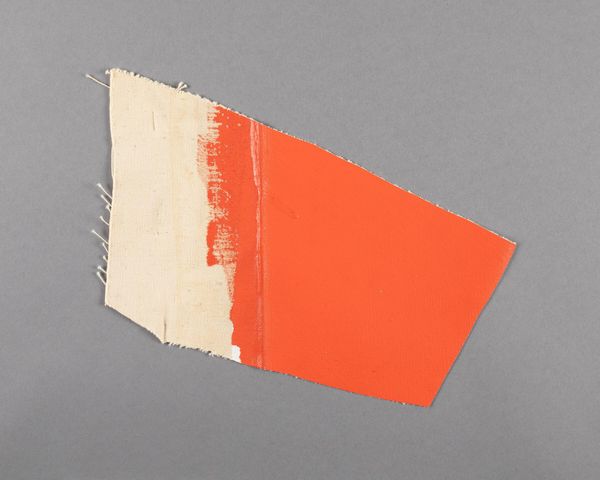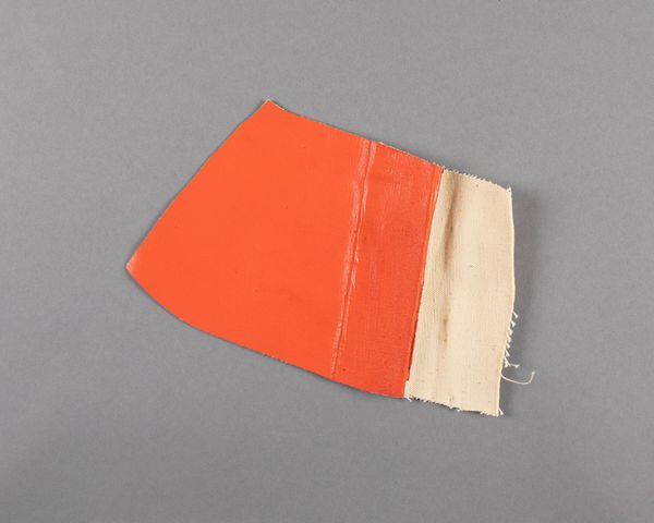 Editor: Here we have Barnett Newman's "Painted canvas fragment," of unknown date, residing at Harvard Art Museums. It's a small, irregular piece of canvas with a bold orange stripe. What strikes me is the raw, almost accidental quality. What do you see in this piece? Curator: It's fascinating as an example of Newman's process. Consider the materiality: the canvas itself, likely unprimed, and the direct application of paint. Was this a study? A discarded element? Its value lies in revealing the artist's engagement with materials. Editor: So, it's less about the finished artwork and more about the act of making? Curator: Precisely. This fragment challenges our notions of artistic intention and labor. It forces us to ask: what constitutes a complete work of art, and how does its creation reflect broader social and economic contexts? Editor: I never considered a fragment could speak so loudly about the artistic process. Thanks for that insight! Curator: Indeed. It’s a reminder that art exists not only in the final product, but also in the artist's actions and choices during its creation.