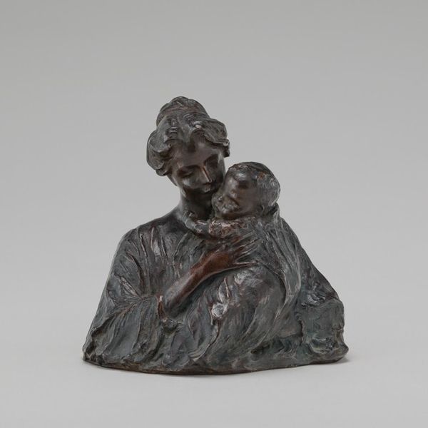 Curator: Here we have Bessie Potter Vonnoh's bronze sculpture "Enthroned", created sometime between 1902 and 1910. Editor: The patina immediately strikes me—that deep, almost sorrowful green-brown. It lends the figures a sense of gravity and permanence. What does 'enthroned' suggest here? Curator: It's a portrait of domesticity, of course. Look at the way Vonnoh has rendered the folds of the woman's gown, how they pool around her, creating a sense of volume and weight. This was cast using the lost wax method, where she built the mold of this complex form and then melted the wax to form the shape in bronze, preserving very tactile qualities. Editor: Indeed, it seems like a material translation of power structures. She's literally 'enthroned', yes, but she's also a figure whose identity, especially at the turn of the century, was so firmly embedded in her role as a mother and wife. Her authority derived almost entirely from her reproductive labor. Curator: Vonnoh’s artistic production and participation in Arts and Crafts movements sought a connection between high art ideals and craftsmanship to democratize art production—moving towards something more accessible, that could speak to modern domesticity and its materials. The rough-hewn texture, despite the smooth surface of the metal itself, does make it seem more immediate, accessible... less imposing. Editor: And those children clinging to her, one with an almost possessive kiss? It brings to the forefront a visual interrogation of dependence, intergenerational roles, and what we understand to be female duty and labor. Curator: Considering her role in the context of the time as a female sculptor during a moment where those venues of craftsmanship were traditionally dominated by men, Vonnoh pushes our reading of motherhood and work together to forge new visual representation and economic participation within the arts. Editor: This isn't merely a scene of maternal tenderness, it’s a snapshot of the power and limitations inherent in the period's vision of womanhood. Vonnoh challenges what could or should have been conceived from domestic representation at that time. Curator: Precisely. It really emphasizes the artistry, technique, and time required to create objects and narratives we deem mundane. Editor: Seeing her representation really emphasizes how much the narratives and materials associated to this image has change or endured depending on how we perform motherly figures within patriarchal conventions. Thank you.