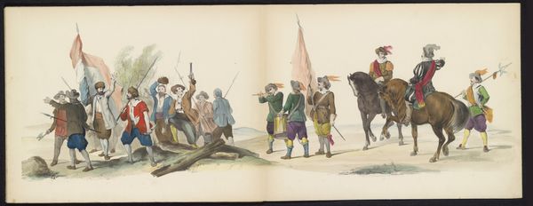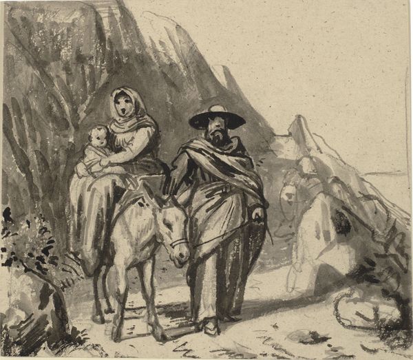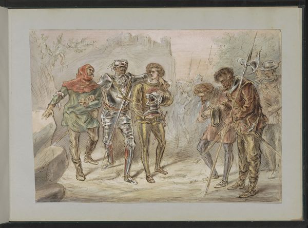 Curator: At first glance, there's a palpable tension in this watercolor, pencil and charcoal drawing, the colors muted yet the expressions so vivid. Editor: That's right. This drawing by Alexander Ver Huell, titled "Een overval in een berglandschap" or "A Robbery in a Mountain Landscape" and dated 1877, feels pregnant with unspoken conflict. You can find it here at the Rijksmuseum. What feelings does it evoke for you? Curator: Foreboding. The almost ghostly mountains in the background set a stage of isolation, while the bandits’ faces reveal desperation, reflecting societal pressures manifesting in their acts. Editor: Exactly. Placing this work within its time, we see the rise of romanticism clashing against stark realities of poverty and desperation. Genre paintings like these reflected and possibly even fueled anxieties about social order, romanticizing "bandits" as rebellious figures challenging unfair systems. Curator: Interesting. I see their clothing as symbols. Notice the hats and makeshift bandanas; each contributes to an archetypal image of the "outsider." It is a construction of an identity, a brand that resonates with rebellion. Editor: But what does rebellion truly mean here? Are these symbols of resistance, or are they appropriated images that romanticize violence, obscuring the systemic inequalities behind their actions? And what does it tell us that the only figure showing what seems like any remorse is the one literally carrying the bag? Curator: Perhaps both are true. Visual shorthand allows complex concepts like oppression and freedom to exist together. The artist employs this ambiguity masterfully to engage viewers with timeless conflicts. Editor: Which asks us to confront how narratives can whitewash actions and their real impact, a poignant point that resonates even today as we discuss class struggle and resistance in different historical moments. I keep returning to the figures, a perfect choreography of dread, hope, and subjugation. Curator: It's in Ver Huell's expert command of media— the layers of watercolor that render both harsh light and concealed motives visible. A complex and unnerving window into history and enduring visual mythology. Editor: An evocative blend, yes, reminding us how art constantly challenges the space between truth and perceived truth and forces uncomfortable dialogues about heroism and villainy.