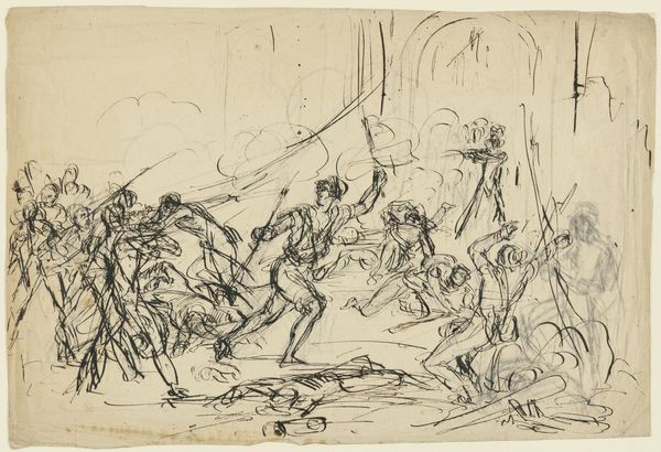 Curator: I'm struck by the starkness of the scene—the raw energy captured in these rapid pen strokes. Editor: Indeed. This is Auguste Raffet's "Study for 'The Skirmish at the Pont d'Arcole.'" Raffet, who lived from 1804 to 1860, really captures the fervor of revolutionary violence here. Curator: Violence, yes, but also, I see a certain performativity. The central figure, flag in hand, almost seems to be posing amid the chaos. Are we meant to see him as a symbol, perhaps of masculine bravado in the face of political upheaval? Editor: Absolutely. The work resonates with Jacques Lacan's theories about the mirror stage, reflecting how individuals construct their identities through the gaze of others during times of conflict. The soldiers' struggle isn't just for land; it's for a self-image reinforced by violence. Curator: I find myself thinking about the broader context of French identity during the period. How did this image, or images like it, contribute to the myth-making around revolutionary heroes and the justification of violence in the name of liberty? Editor: Raffet gives us a study of a skirmish, but also, unconsciously, a study in the performance of ideology. Curator: A chilling insight. Editor: It certainly gives a new lens through which to view the formal elements of the work.