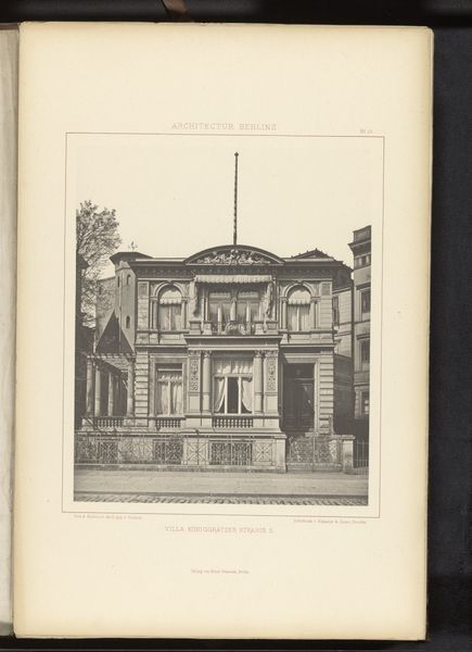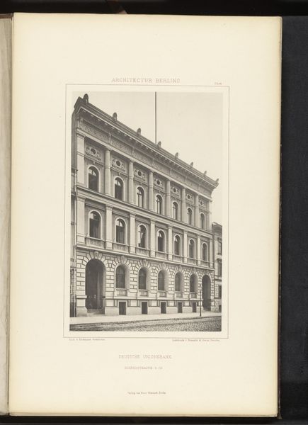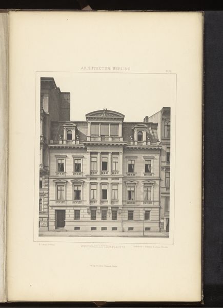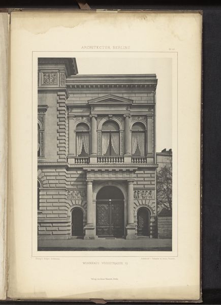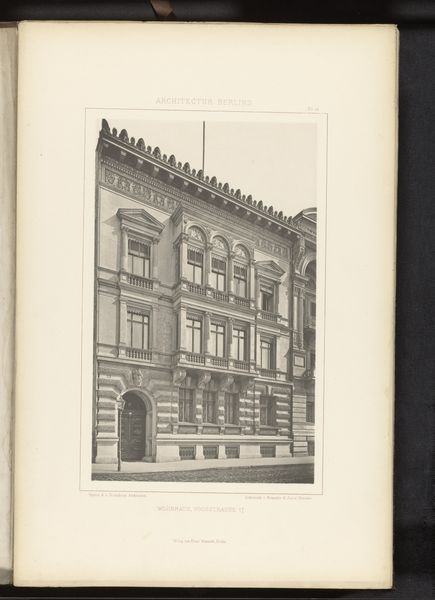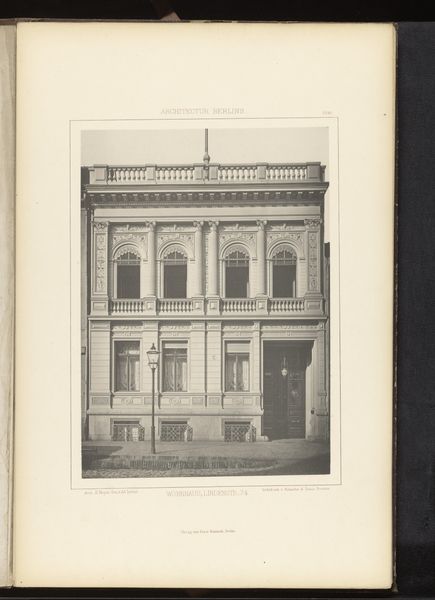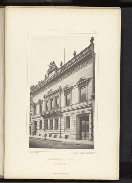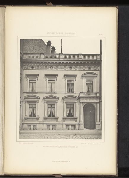 Curator: Immediately striking, isn’t it? This photograph captures a façade on Leipzig Strasse in Berlin, sometime before 1877. It’s currently held here at the Rijksmuseum. Editor: It feels…imposing. Solid, impenetrable. Almost aggressively symmetrical. All those rectangles, neatly stacked. Like a cake made of stone. Curator: The architecture, rendered in detailed monochrome, certainly presents a study in geometric formalism. Note the balanced arrangement of windows, the emphatic cornices, and the subtly projecting central bay. One could argue the composition speaks to the aspirations of nascent German nationhood: order, strength, and prosperity all captured in stone. Editor: Orderly yes, prosperous I'm not so sure about. The overall effect is a tad gloomy, don’t you think? All those closed windows seem to stare out blankly. I wonder what stories are hidden behind them. It could be the portrait of perfect upper class propriety... or something altogether more…dark? Curator: Perhaps. But observe how the photographer has used light and shadow to articulate depth and volume. This modulation avoids flatness, revealing the distinct textures inherent within the stonework. Editor: Yes, there is that textural interplay. Still, beyond the technical aspects, the building speaks, doesn't it? Maybe of secrets, longings, the ghosts of forgotten lives. Do you think it housed one large family, or perhaps multiple apartments? Each with its own internal drama? Curator: Speculation, of course, moves beyond strictly formalist considerations, though the interplay you posit does complicate readings of urban life in the period. Consider the implications if the building housed a diverse range of social classes. How do these formal structures shape lived experiences? Editor: And were they happy? That building feels like a stern headmaster. Hard to imagine joy echoing from its depths. Curator: Ultimately, as a record of a specific architectural moment, this photograph grants insights into aesthetic and cultural priorities. Editor: Yes, and those stone walls remind us that sometimes even buildings keep their secrets better than people do. A melancholy grandeur, locked away.