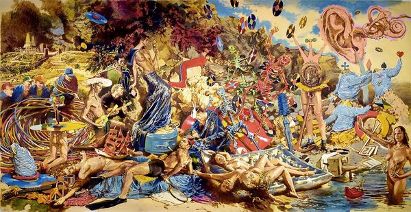 Neo Rauch's painting, Die Kontrolle, presents a fragmented scene rendered with flat, bold colors and a disjunctive composition. The work is divided into two panels, each a jumble of figures and objects that seem to exist independently. A palette of vibrant blues, greens, and reds clashes with a stark pink wall, creating a visual discord that is both jarring and intriguing. Rauch destabilizes established meanings by juxtaposing seemingly unrelated images. This reflects a poststructuralist concern with the instability of language and the impossibility of fixed interpretation. The painting invites us to question the narrative coherence and to consider how meaning is constructed through the arrangement of disparate elements. Each signifier - each figure, color, or shape - functions within a complex semiotic system, creating layers of potential interpretation. The formal qualities of this painting - the fractured composition, the clashing colors, and the ambiguous figures - function as a means of exploring the fluidity of meaning. The visual disjunction challenges the viewer to actively construct their own understanding, recognizing that art does not offer fixed answers but rather opens up new possibilities of interpretation.
