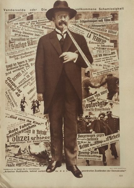 Editor: Here we have John Heartfield's cover and illustrations for Kurt Tucholsky’s book, 'Germany, Germany above All', created in 1929. It seems to be a photomontage with a really strong, almost jarring visual impact. The figure’s face is obscured, and the colours are stark. What stands out to you? Curator: The immediate impact arises from Heartfield’s strategic deployment of fragmentation. Note the disjunctive juxtaposition of photographic elements; a face sliced and obscured by graphic interventions, rendering the portrait grotesque. The bold use of a contrasting yellow background serves to amplify the disturbing aspects of the central figure. Editor: Disturbing is definitely the right word. I’m intrigued by the use of text integrated with the image; how does that function compositionally? Curator: The text, diagonally assertive across the yellow plane, isn't merely descriptive, but becomes another layer of disfiguration. Consider the blackletter typeface and how its historical connotations, particularly in Germany, contrast against its deconstruction. This deliberate friction creates a visually disruptive force that intensifies the satirical intent. What emotions are evoked? Editor: A sense of unease, definitely, but also defiance. The fragmentation, the obscured identity… it all speaks to a critique of something larger. Seeing how Heartfield utilizes composition and form, it underscores the powerful message, a biting political commentary. Curator: Precisely. Form contains function and provides access. His method offers viewers the structure needed to reflect and resist. Editor: Thank you, this look at the forms and context made it easier to decode the symbolism. Curator: My pleasure; visual literacy demands we remain attuned to compositional elements, always.