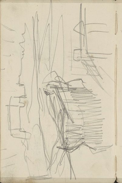 Editor: This is George Hendrik Breitner's "Gezicht op een gracht te Amsterdam," created between 1886 and 1923. It's a pencil drawing on paper, and its rapidly drawn lines create a wonderful sense of immediacy. What do you see in this piece, beyond the obvious subject matter? Curator: Focusing solely on its formal qualities, the drawing presents a compelling study in line and form. The verticality of the slender architectural forms is counterposed by a strong horizontal, bisecting the composition and creating an inherent tension. Editor: Tension? I wouldn’t have used that word… Curator: Indeed. The very lack of detail contributes to this feeling. Observe how the varying weight of the pencil lines defines space. The denser, more frantic scribbles on the right imply a sense of contained energy, while the sparser marks suggest recession. Notice the blank areas: How do these "negative spaces" play a role in creating an atmospheric perspective, an absence? Editor: So, you're saying the sketchiness is a deliberate artistic choice, and not just an unfinished work? Curator: Precisely. The essence of the image lies in its suggestion rather than its explicit depiction, inviting us to project our own interpretations onto it. The semiotics of line quality serve as the main signifier. What meaning can we extract? Is there inherent value in deconstructing these? Editor: I never really thought about a sketch in terms of… signs and tensions. This approach gives a whole new level of appreciation. Curator: Indeed, recognizing the aesthetic potential and underlying principles allows us to grasp an artist's vision more clearly, and to realize that a sketch stands on its own formal merit.