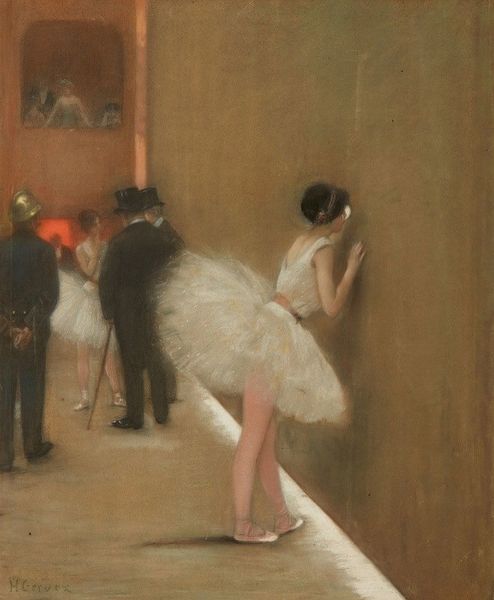 Curator: Henri Gervex transports us to a lavish affair with "Le Bal de l’Opéra," painted in 1886. What are your initial thoughts? Editor: It's undeniably opulent. There's a palpable sense of hushed intrigue amidst the gathering; the soft impasto, especially, adds a dreamlike quality to this slice of Parisian high society. Curator: Note how Gervex organizes the composition. We see figures positioned in receding planes; observe the balcony scene in relation to the shadowy crowds and ornate architectural backdrop. How does that direct your viewing? Editor: Precisely. This hierarchical staging reflects the socio-political dynamics of the era; wealth and status prominently displayed. This visual layering isn't just about spatial depth. Curator: Absolutely. Gervex cleverly utilizes chiaroscuro—the sharp contrast between light and shadow—to emphasize key figures. The woman in white, for example, becomes a focal point due to this play of light. Are there potential connotations? Editor: Undoubtedly, and let's acknowledge that there is a slightly erotic current running through this image, amplified by the masquerade element, by masked people who might get away with a bit of transgression! The ball allowed social classes to mix, but more likely, these are scenes from the gilded lives of elites on display at the Opera. Curator: It’s a very complex, compelling snapshot into late 19th-century Parisian life, indeed, and this tension between visibility and anonymity really characterizes the society. Gervex also subtly criticizes class inequality. Editor: And Gervex isn't afraid to delve into these complexities, making "Le Bal de l’Opéra" not just a pretty picture, but also a complex representation of a society at a turning point. Curator: Agreed; reflecting on it all, it remains a vibrant meditation on light, shadow, and social structure, inviting us to reflect on both the glittering surface and the deeper currents of 1880s Paris.