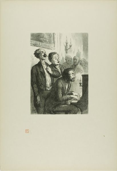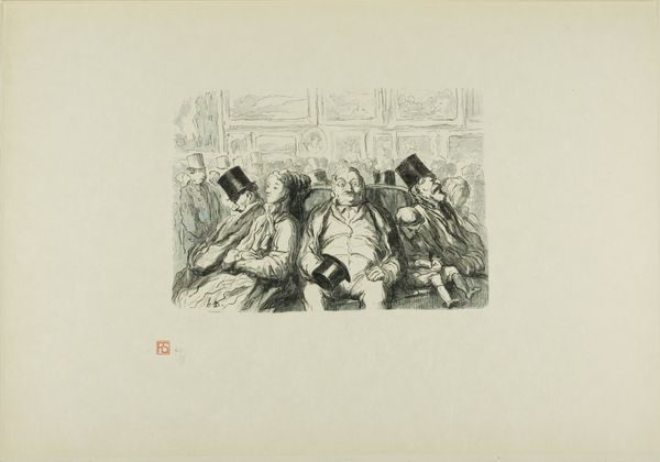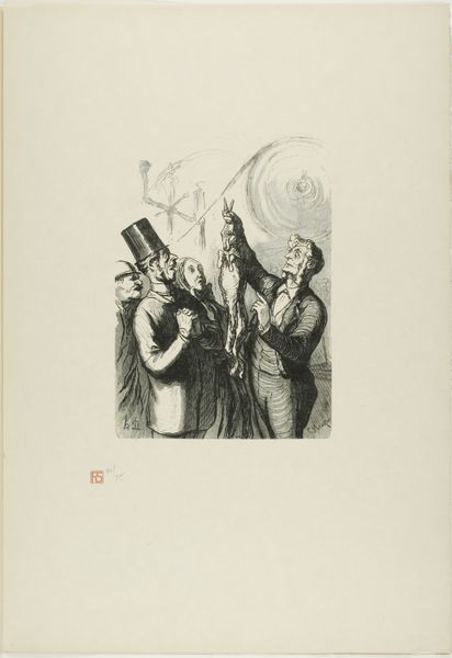 Curator: This little print… it’s by Charles Maurand, possibly created between 1867 and 1920. It's called “At the Universal Exhibition: Security check at the entrance: the bald need to lift their hats, and the short-sighted need to remove their glasses.” Editor: What strikes me immediately is the… cheeky awkwardness of the scene. Everyone looks so put out! And the artist’s rendering, with those almost frantic lines, amplifies the chaos. Curator: It does capture a sort of controlled frenzy, doesn't it? It’s an engraving, a technique that lends itself to such crisp, almost barbed lines. It really captures the experience, the tension of a modern crowd in an exhibition meant to celebrate unity and progress. Editor: Precisely! We see how security measures, ostensibly for everyone's safety, inevitably create hierarchies of access and bodies, right? The bald and the short-sighted suddenly become marked, their physical "deviations" flagged. Curator: There’s such dry wit in targeting these most innocuous characteristics. Like, of all things to be suspicious about... But the drawing’s more than just satirical, though, isn’t it? Look at those faces. They’re portraits, but also caricatures, types. The exasperation is practically etched onto their faces! Editor: Absolutely. Maurand taps into that deeper anxiety about difference, especially in the context of nationhood and these displays of globalism. It suggests that belonging isn’t so easily granted, even at a world's fair. Curator: The title spells out that people attending should have their vision tested. Everyone becomes part of the spectacle, right? They become actors performing their identity for the gatekeepers. The exhibition space becomes less about celebration and more about surveillance. Editor: Indeed! It forces you to consider who designs those checks and balances. This small engraving holds within it this immense sociopolitical commentary on accessibility. Even if Maurand had the same insight or perspective, what it reflects back at us now matters much more. Curator: In essence, a seemingly trivial moment blown up into a microcosm of broader social control mechanisms. Editor: Precisely! And now, when entering this gallery or exhibition, consider all those who had to struggle for that same entry.