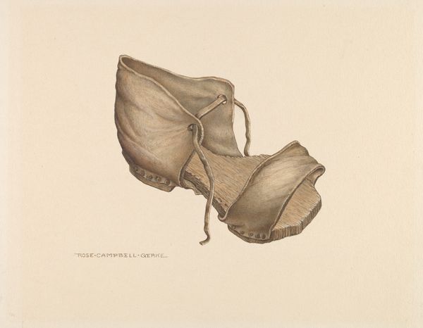 Curator: This compelling drawing is titled "Shoe" and was created sometime between 1935 and 1942, the artist is unknown. It's rendered in pencil on paper. The simplicity of the medium underscores the subject matter. Editor: It's a lonely object, isn’t it? There's a somber quality, despite its humble subject. The muted tones lend an antique feel, a sense of faded memory. Curator: Certainly, the realism leans toward melancholic representation, quite unlike, say, Surrealist depictions that might explore shoes in more provocative ways. Considering the artwork was produced between the mid-30s and early 40s, we might understand "Shoe" as a commentary on everyday lives affected by political conflict. Editor: Possibly. Shoes carry powerful cultural weight, signifying journeys, status, or gender. The sole is quite worn down. Does it indicate weary footsteps or is it just a rendering of lived experience during these difficult years of war, but in more metaphoric ways? Perhaps, the laced strings suggest attachment or constraint... or the ties that bind society, which appear delicate, on the verge of tearing apart. Curator: That’s a valid observation, I’d like to think about its role for anonymous portraiture during this period. Focusing on personal items makes the symbolic weight more about a personal reflection, rather than a social commentary about the implications of class and mass production for other works. Editor: It reminds me how mundane items often become poignant symbols during moments of upheaval. Curator: Indeed. The historical weight combined with the intimate scale invites us to consider both the grand narrative and the quiet resilience of everyday life during such transformative times. Editor: Yes, I think I understand its gravity a little better now. It's about those uncelebrated journeys. Curator: Ultimately, it reminds us that art doesn't need grand gestures to speak profoundly to our shared history.