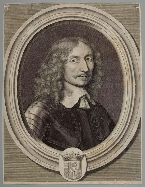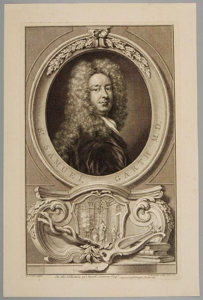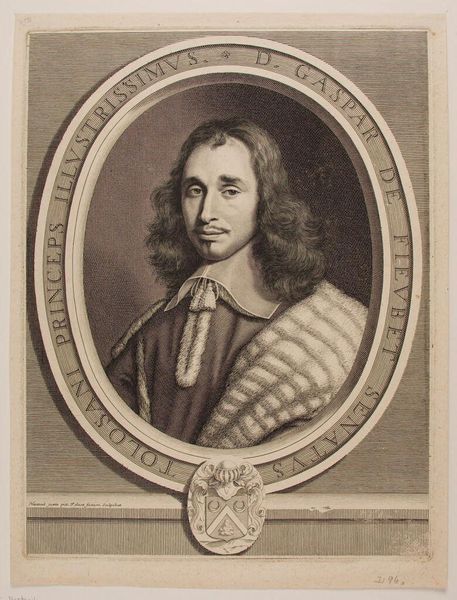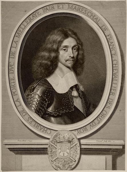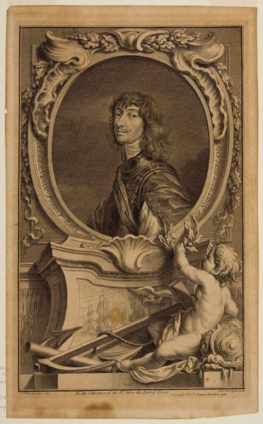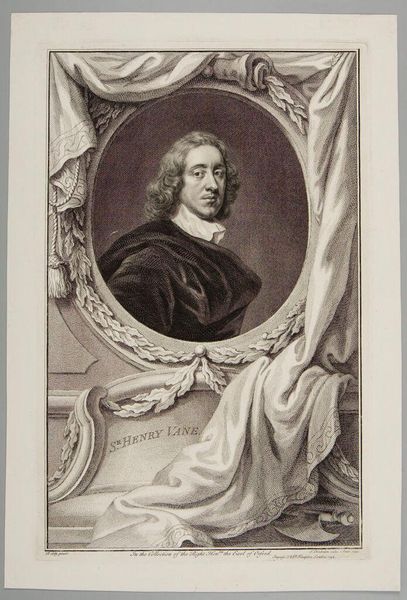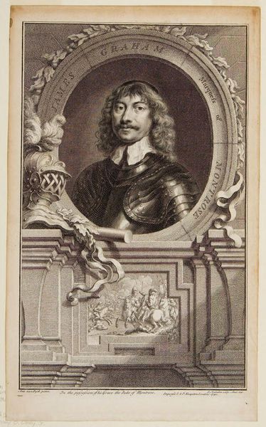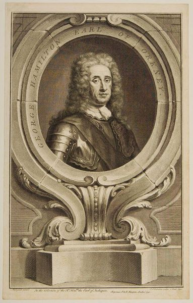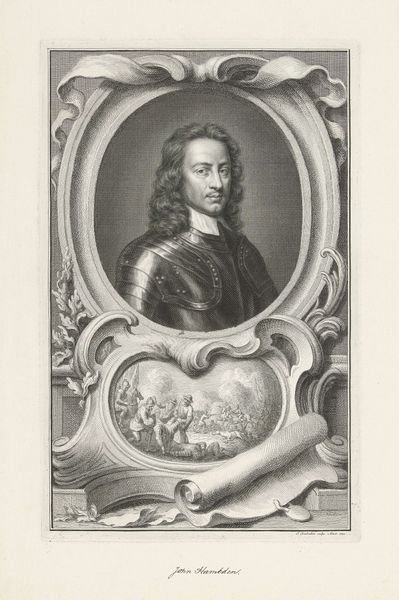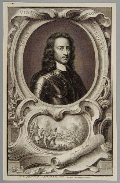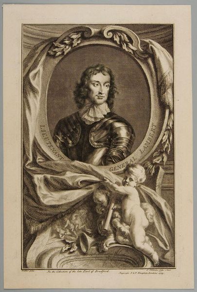 Editor: This is Jacobus Houbraken's portrait of Lieutenant General Charles Fleetwood. The stark black and white, and the intricate detail, create a sense of formidable power. What stands out to you in its composition? Curator: The engraving is a fascinating study in contrasts, is it not? Note the sharp delineation between light and shadow, creating depth and volume. The ornate frame juxtaposes with the subject's direct gaze, a tension between ostentation and austerity. Editor: So, the frame isn't just decorative. It’s part of the statement? Curator: Precisely. It is a crucial element in understanding how the artist wants us to perceive the subject. Consider the deliberate use of line and form. What does it tell us about the values of the time? Editor: I see now, the lines create a really complex interplay between the figure and the setting. Thanks for pointing that out! Curator: A fruitful analysis, indeed.