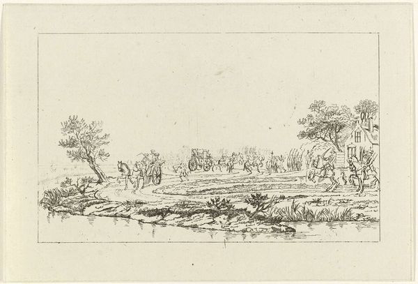 Esaias van de Velde made this pen and brown ink drawing called 'Landschap met wandelaars overvallen door een struikrover' in the 17th Century. Van de Velde lived during the Dutch Golden Age, a period of immense economic growth and social change in the Netherlands. The drawing depicts a landscape where class distinctions and social vulnerability intersect. In the foreground, we see travelers being robbed, highlighting the ever-present threat to personal safety. Gallows are on a hill in the distance. This was a common sight in the Dutch landscape, serving as a stark reminder of the consequences of defying social norms and hierarchies. This artwork encapsulates the era's focus on realism while suggesting broader anxieties about social order. It encourages us to reflect on the complex relationship between power, vulnerability, and the human condition during a time of transformation.