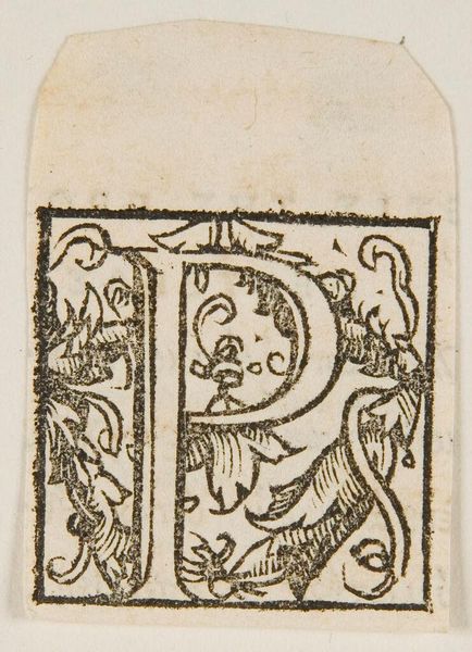 Editor: This is Letter P, by an anonymous artist. The linework creates a very decorative feel to something as simple as a letter. What do you see in the composition? Curator: I notice the interplay between positive and negative space. The black ink defines the letterform and the surrounding organic shapes, but the white space within these elements is equally crucial. It guides the eye and creates a sense of balance and visual interest. Editor: So the shapes within are just as important as the letter itself? Curator: Precisely. Consider how the curving lines and leaf-like motifs echo the shape of the "P," creating a cohesive visual language. Notice also the density of detail versus the plain background. Editor: It's amazing how much can be analyzed in such a small piece! Curator: Indeed, even a seemingly simple design reveals layers of complexity when we examine its formal elements closely.