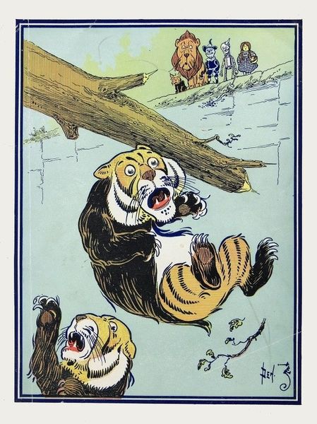 William Wallace Denslow created this illustration for "The Wonderful Wizard of Oz". Published in 1900, it reflects the anxieties and aspirations of its time. Denslow's image captures a pivotal moment: Dorothy's encounter with the Cowardly Lion, subdued by winged monkeys. But what does it mean to depict a lion – traditionally a symbol of courage and royalty – in a state of captivity? The Lion's bondage could be seen as a metaphor for the constraints placed upon individuals by societal expectations and the struggle to overcome inner fears. Dorothy, a young girl, stands before the lion, an implicit commentary on power dynamics, vulnerability, and the potential for empathy to bridge divides. Denslow's illustrations broke from traditional children's book imagery, mirroring the era's shift toward a more modern, visually engaging storytelling. He encourages us to reflect on the multifaceted nature of identity, courage, and the quest for self-discovery, reminding us that appearances can be deceiving.
