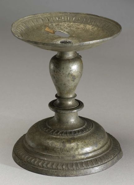 Editor: So, here we have "Merchandise," a candlestick from around 1590 to 1596, by an anonymous artist, currently held at the Rijksmuseum. It’s crafted from metal and perhaps some ceramic. It has such a utilitarian feel. What's your take on this piece? Curator: What interests me immediately is the material. Metalwork, particularly in the late 16th century, represents a significant shift in artisanal production and the widening availability of goods. This isn't just a candlestick; it's a symbol of increased commodity culture. Editor: A symbol, really? Curator: Absolutely. Consider the labor involved in extracting, refining, and then shaping the metal. Was this piece mass-produced or made by a single artisan? That affects its status. Look at the visible wear and tear – these aren't just imperfections; they tell a story of use and consumption, part of the object's biography. Editor: That's true; you can almost imagine its life. But does its being functional reduce its artistic value? Curator: On the contrary, it enhances it. By engaging with a traditionally domestic object, we interrogate the supposed divide between "high art" and "craft". Was the craftsman aware of artistic trends? What sort of workshop was it made in? These aspects make the work particularly compelling. Editor: I hadn't thought about it that way before. Focusing on its materials really opens up new questions. Thanks! Curator: My pleasure. Now you can perceive it for its socio-historical values, embedded in its physicality.