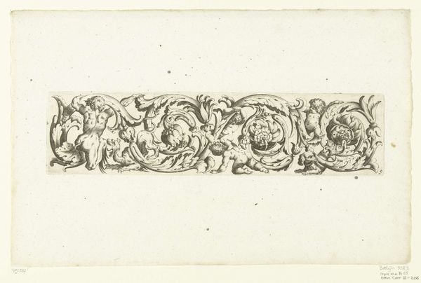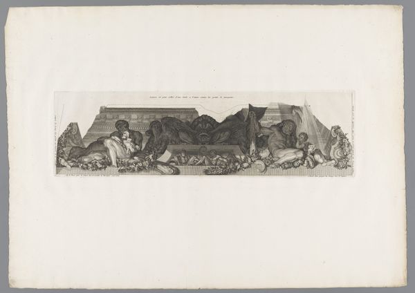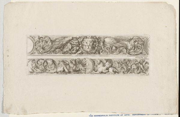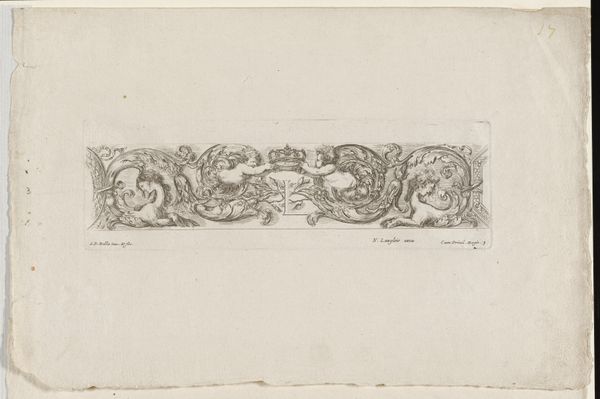 Editor: This is "Plate 9," an etching by Stefano della Bella, created around the 17th century. It feels very classical in its subject matter, like something you'd see on a frieze. What strikes me most is the artist’s command of line; how does one even begin to interpret the composition of this engraving? Curator: The composition hinges on a sophisticated manipulation of form and space. Note the horizontal format, segmented into registers, echoing classical relief sculpture, a point you rightly observed. Della Bella uses the linear quality of etching to create both detail and depth. The primary register, populated by figures in dynamic motion, contrasts with the register below populated with static animal forms, does it not? Editor: I see the division. There's a real tension between movement and stillness across those two registers, the figures in the top panel versus the reclining creatures below. It gives the piece a unique rhythm. Curator: Precisely. This interplay generates a visual cadence. Observe also the use of negative space. Della Bella skillfully uses the white of the paper, that toned paper you referenced, to define forms, adding dimension, but equally as an activation of plane, as foreground and background compete, wouldn’t you say? Editor: So the 'empty' space is as crucial as the lines themselves in creating the overall effect. Is there anything particularly interesting about the symmetry, or lack thereof? Curator: Ah, the symmetry is a deliberate choice to avoid monotony. A strict symmetrical arrangement might flatten the image, while the asymmetry, subtle though it is, infuses energy and contributes to a more visually dynamic, if eccentric, presentation, giving life to the composition, no? Editor: That makes a lot of sense. I hadn't considered the dynamic aspect of asymmetry here. Thank you for helping me see it with fresh eyes. Curator: The pleasure was mine. Approaching artworks from the sole point of formal structure always presents novel vantage points.