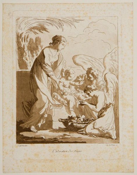 Curator: Bartolomeo Pinelli's small etching, "The Children's Lunch," presents an intimate domestic scene. What are your initial impressions? Editor: The stark contrast of light and shadow creates a somber mood, despite the title suggesting a nourishing act. Curator: Pinelli’s choice of imagery certainly adds layers of meaning. Note the cross, the memorial tokens hanging on the wall – symbols of loss and remembrance. They cast a shadow on this seemingly ordinary meal. Editor: Yes, and the composition itself, with the mother centrally placed, almost Madonna-like, feeding her child, draws the eye immediately. But what about the other children, seemingly excluded? The child hiding their face, the other resigned to eating on the floor. Curator: These figures speak to broader themes, don't they? Of childhood innocence overshadowed, the weight of poverty perhaps, clinging to familial love. Pinelli uses these archetypes to explore the emotional landscape of family. Editor: I see it. The material quality of the etching – the fine, cross-hatched lines – ironically enhances the starkness, amplifying the emotional weight. Curator: A potent reminder that even simple acts resonate with deeper cultural and personal significance. Editor: Indeed, and the artist's formal choices certainly amplify that message.