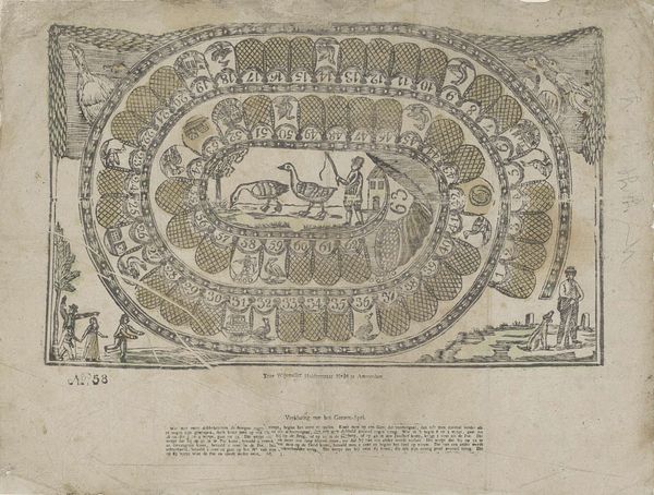 Curator: This image looks like it was pulled straight from a game night in a Victorian parlor. So charmingly intricate! Editor: It is rather captivating. What we're observing here is a print titled "Nieuw / ganzen-spel" dating from somewhere between 1832 and 1850, made with ink, as a form of graphic art. "Nieuw / ganzen-spel", for our non-Dutch speakers, roughly translates to New Game of Goose. Curator: Oh, a game board! I can totally see the whimsicality and all these funny images. The line work has this sort of innocent clumsiness to it that makes me smile. Like, who's the guy hanging upside down there by space 58?! And what does it all MEAN?! Editor: Well, "Game of the Goose," as you might know, had origins dating back centuries to Renaissance Europe. This particular print would have provided an engaging activity, maybe even offering insights into societal mores. Curator: Mores...or maybe just geese! I feel such warmth looking at this. Not in an academic, stuffy kind of way, more like a cozy evening playing games with my quirky family. The kind you think only you have until you binge watch reality TV. Editor: I appreciate your sentimental perspective. However, let’s consider its deeper layers. A game of chance can reflect historical anxieties of fate, social mobility. It may even give the players an impression that you can navigate through life's various challenges – as symbolically encoded through each position of this board. Consider, for instance, this jail near space 52 – this imagery of enclosure evokes a period’s sense of justice or captivity. Curator: Imprisonment or losing the game. Ha! To each their own meaning. Though you are making me look more carefully at what these spaces might stand for in a larger symbolic sense. It certainly encourages you to ask, what did these images mean to people almost two centuries ago? Editor: And that’s a significant point to ponder, really. How an object, seemingly so lighthearted on its surface, contains within it these multiple strands, inviting both playful interaction and also reflection. Curator: So next time my family is screaming over Monopoly, I'll just have to remind them they are playing out an age-old symbolic struggle for their very souls! Editor: Absolutely, though perhaps a lighter interpretation is best left for game night itself.