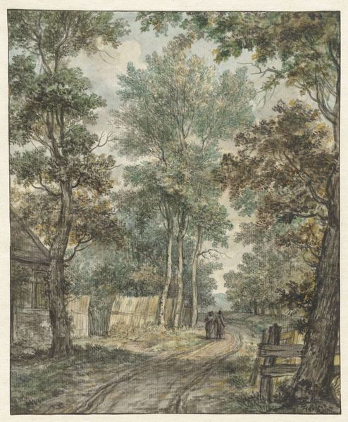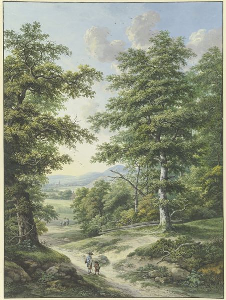 Editor: Here we have Sebastiaan de Ranitz's "Landscape with Two Trees, A City in the Distance," created around 1875 using watercolors. It feels very serene, almost like a memory fading into the past. What stands out to you in terms of its historical context? Curator: It's fascinating to see the rise of landscape painting coincide with increasing urbanization. How do you see this work reflecting the changing social attitudes towards nature and rural life in the late 19th century? Was it a rejection, an idealization, or something more complicated? Editor: That's a good point. Perhaps it was a way of holding on to a disappearing way of life? A subtle protest, maybe? Or a form of escapism for a society rapidly industrializing? Curator: Exactly. Also consider the accessibility of materials at the time. Watercolor paints became more readily available, encouraging artists to work en plein air, capturing fleeting moments directly from nature. Who had access to the means and leisure to create art, and what stories were they choosing to tell? Editor: I see... so even the choice of watercolor contributes to our understanding of its societal place, of where painting took place! And for whom! It makes me wonder how digital landscapes today will be viewed in the future. Curator: Precisely! Reflect on the institutions that valued and preserved such artwork, too. How did private collectors or public museums shape the perception and value of landscapes like this one? Editor: That frames the artwork, the painting, in such a bigger, and more real, context. Thanks so much. Curator: My pleasure. Thinking about how societal shifts shape artistic expression provides invaluable insights.