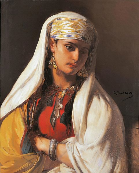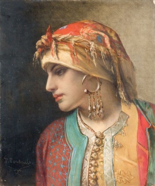 Editor: This is "Portrait of Young Moor" by Jean-François Portaels, created with oil paint. There’s such a direct gaze, yet something veiled and mysterious in her expression. What do you see in this piece? Curator: Ah, yes. This work draws us into a world painted with the hues of Orientalism. It is very much from a time when "the Orient" was a romantic idea for many European artists. Think of this portrait less as a literal document and more as a dream. Editor: A dream? Curator: Precisely. Notice the softness, the light... Portaels isn’t trying to capture objective reality so much as evoke an atmosphere, a feeling. This young woman exists more as an emblem of beauty, perhaps even of exoticism, than as an individual. But, one must also ponder: whose dream is this? And what power dynamics are woven into that dream? Editor: So it’s not just about capturing beauty but also about the artist’s, and perhaps the audience's, preconceptions. Is it problematic then? Curator: That’s where it gets intriguing, doesn’t it? Art can be beautiful and complicated at the same time, revealing as much about its creator’s world as it does about its subject. Perhaps, looking at her, we should question ourselves, our own assumptions. What does this gaze tell us about how we interpret the "other?" It can open up for complex considerations and conversations. Editor: I didn’t expect to question my own assumptions, but art always has something new to say. Curator: Indeed! Isn’t that why we are drawn to it? Art's charm is always being able to view something in multiple dimensions and varied subjectivities.