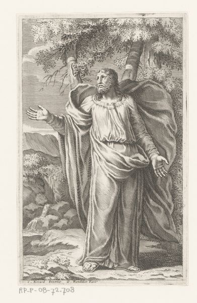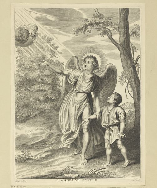 This print, *Child with Guardian Angel*, was made by Cornelis Galle I, around the turn of the 17th century, using the technique of engraving. Galle would have used a tool called a burin to manually cut lines into a copper plate, a labor-intensive process that demanded precision and skill. The image shows a guardian angel guiding a child through a landscape. The fine lines of the engraving lend a remarkable level of detail to the scene, from the angel's feathered wings to the texture of the trees. The deliberate, careful process of engraving speaks to the religious nature of the print, intended to provide spiritual guidance. It's worth remembering that prints like this one were luxury goods, requiring both artistic skill and access to specialized equipment. The act of making this print also carries social significance, reflecting the religious and cultural values of its time. By appreciating its materiality and the labor involved, we recognize that craft and fine art are closely intertwined.