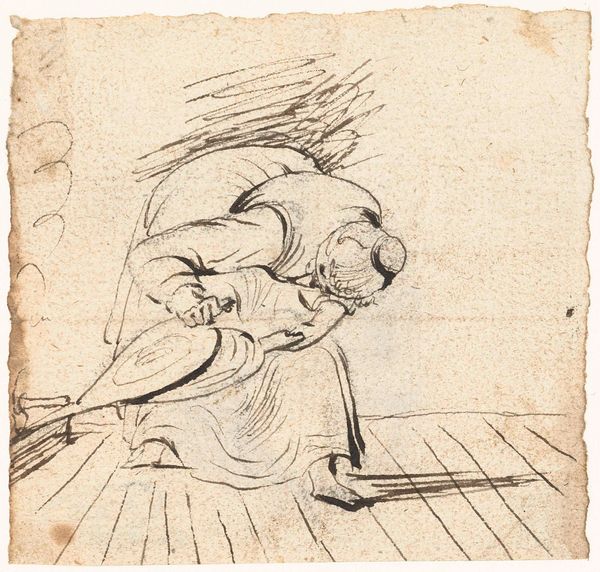 Martinus Rørbye made this drawing in 1848, using ink on paper. The artist's hand is very evident here, not just in the subject, but the quick, assured lines of ink, a medium which allows for little correction. The paper itself is also worth noting. It's not fine art paper, but rather, a page torn from a notepad or perhaps an almanac, with faint lines of text visible. The drawing has an immediacy, as though Rørbye captured the figure in a moment of contemplation. The fluidity of the ink gives a sense of volume to the figure, with rapid strokes implying shadow and form. It is a study, an intimate glimpse into Rørbye's artistic process. By choosing such a commonplace material as a notebook page, Rørbye collapses the distance between high art and the everyday, reminding us that creativity often emerges from the simplest of means.