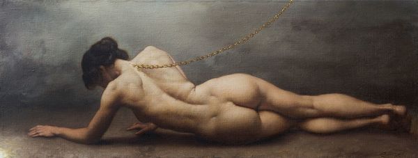 Roberto Ferri painted "La Profezia" using oil, in what appears to be a contemporary revival of Baroque aesthetics. Immediately, we’re struck by a nude male figure rendered with meticulous anatomical detail. His eyes are covered by a white bandage. The palette, dominated by earth tones, enhances the dramatic chiaroscuro effect, intensifying the emotional impact of the scene. The composition teeters between classical idealism and surreal symbolism. Note the bisected head that exposes the brain with an instrument piercing through, and the severed cat's head dangling from his hand. These motifs challenge our understanding, disrupting traditional notions of beauty and rationality. The artist destabilizes conventional dichotomies between the rational and irrational, the beautiful and the grotesque. This painting invites ongoing interpretation. The formal elements, such as the hyperrealistic rendering and the stark contrasts, serve not merely aesthetic purposes but engage in a dialogue about the complexities of human experience and the ambiguity of knowledge.