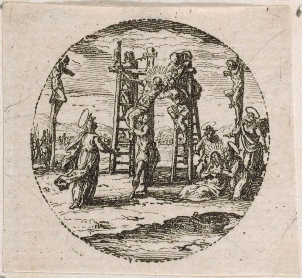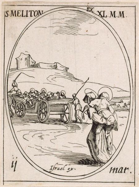 Editor: This delicate etching is Jacques Callot's "Saint Anne". I’m struck by the clarity of line, given its tiny size. It feels like a frozen moment, a revelation. What visual echoes or deeper meanings do you see within this work? Curator: Notice how Saint Anne, both named and identified as a prophet within the oval frame, gestures forward, almost introducing the viewer to the scene behind her. The halo is an obvious symbol, but how does her gaze affect your reading of the narrative, and what does it tell you about the relationship between the figures depicted? Editor: That's fascinating! It makes me think about the power of the image and the enduring importance of symbols. Curator: Indeed, and how those symbols continue to resonate across generations.