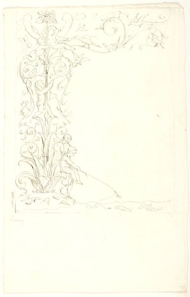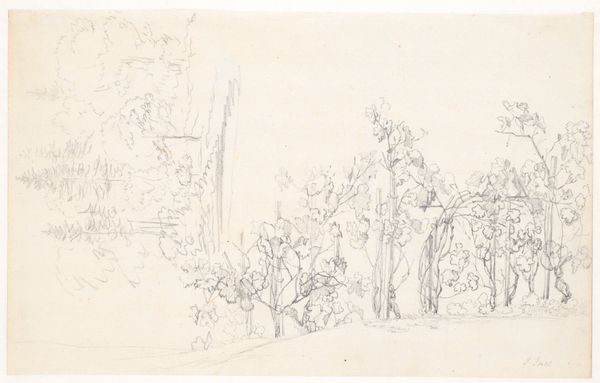 Curator: This drawing, "Forester's lodge with lovers", is by Peter Becker and held here at the Städel Museum. It’s rendered in pencil on paper. Editor: It feels like a dreamscape, almost ephemeral with those light pencil strokes. The lovers are just a suggestion, really, dwarfed by the imposing architecture. There's a sense of melancholy, I think. Curator: The choice of material emphasizes the work's purpose, wouldn’t you agree? Pencil on paper allows for corrections, revisions, showing process. This likely wasn't intended as a final, polished piece, but rather a study or preparatory sketch. Think about the economic value then too, pencil and paper, both accessible, immediate tools of the working artist. Editor: It speaks volumes, indeed, about accessibility. However, let's also consider the cultural lens. This Northern Renaissance aesthetic idealizes a sort of retreat into nature. Who has access to that retreat, to that pastoral fantasy? The lovers seem placed, positioned, almost staged. Are they participating in that ideal, or performing it for an elite gaze? Curator: A pertinent point. The lodge itself suggests an architecture embedded within specific labor practices. Who built it? Who maintains it? Becker probably had a relationship to the patronage system where even romantic landscape drawings served social function of idealizing and often obscuring wealth accumulation tied to extraction of resources. Editor: Absolutely. We can’t ignore how often these idealized landscapes erase the labor and environmental impact of resource extraction and luxury lifestyles from that era. The almost ghostly presence of the lovers in the foreground makes me wonder, what narratives are being omitted? How is the artist complicit in these elisions? Curator: Fascinating how we can look at a seemingly simple sketch and unravel layers of material realities and cultural critique! The subdued nature of pencil work is now heightened, even more loaded. Editor: It reminds me that art is rarely just 'art.' It's a site of power, negotiation, and very human complexities.