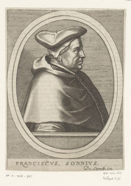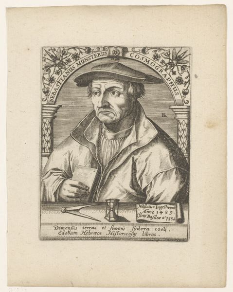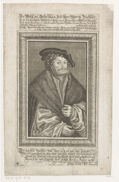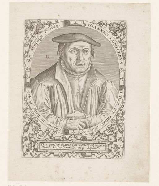 Robert Boissard created this engraving, "Portret van Johann Oldendorp," sometime in the 17th century. The work presents a study in contrasts between the detailed rendering of the subject and the patterned border. The sitter, Johann Oldendorp, is captured with precise lines that define the texture of his fur-lined coat and the folds of his garments, lending a tactile quality to the image. Boissard's use of line becomes a semiotic device, distinguishing social status and intellectual gravitas through meticulous detail. This formal approach reflects a broader cultural interest in the period for categorizing and codifying social identities. The ornate border, teeming with flora, acts as a frame and serves to highlight the portrait. Ultimately, the engraving functions as more than just a likeness; it is a carefully constructed representation that engages with contemporary ideas about identity, representation, and the power of the image to convey complex social meanings. This layered complexity invites us to continually reinterpret its cultural and artistic significance.