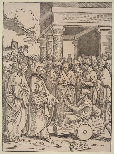 Hieronymus Ferroni created this engraving, Saints Peter and John healing the sick at the gate of the temple, sometime between 1687 and 1730. During the Baroque period, the Catholic Church emphasized art's role in conveying religious doctrine, often depicting scenes of miracles and divine intervention. Here, Peter and John are shown performing a healing miracle. The image conveys a strong sense of compassion for the suffering. But it also reflects prevailing social hierarchies and expectations around disability and poverty. Those in need are placed in a position of dependence on the Church, rather than as agents in their own lives. Ferroni’s composition directs the viewer's gaze towards the central figures of Peter and John, reinforcing their status as conduits of divine power. How might our contemporary sensibilities challenge this traditional representation? Does the engraving invite us to question the power dynamics inherent in acts of charity and healing? In what ways do we confront such disparities today?