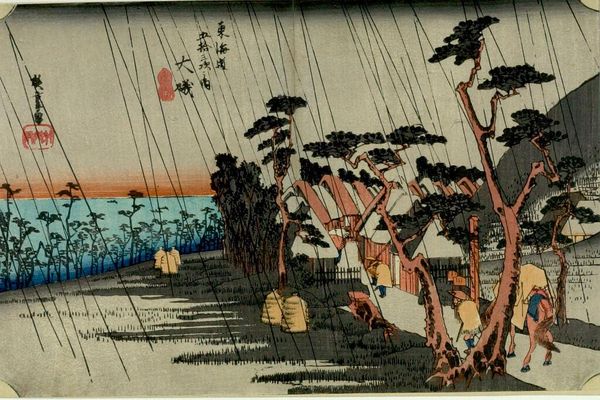 Editor: This is Utagawa Hiroshige's "Station 50 -- Spring Rain at Tsuchiyama," part of the *Fifty-three Stations of the Tōkaidō* series. It feels so immersive, almost like you're caught in the downpour. What do you see in this piece? Curator: I see a commentary on the traveler’s experience, and the societal pressures around mobility in 19th century Japan. The rain, rendered so powerfully, becomes a great leveler, impacting all social classes. It prompts questions about who has the privilege of shelter, and who is forced to endure. Editor: That's a perspective I hadn't considered. So, the artwork isn't just about the beauty of nature? Curator: Not at all. It is about the lived experience of traversing the Tōkaidō, and the inherent inequalities within that journey. Hiroshige uses the rain as a visual metaphor for the shared, yet unequal, human condition. Editor: That’s fascinating. I’ll definitely look at it differently now.