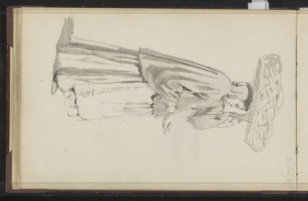 Curator: Alright, let’s turn our attention to this pencil drawing of a woman wearing a hat by Cornelis Springer, possibly dating back to the 1870s. Editor: Mmm, instantly I feel this... elegiac quality? Like a half-remembered dream, all soft focus and fading light. She seems both present and remote, don’t you think? Curator: Indeed, the lightness of the pencil on paper does contribute to that hazy, dreamlike mood. But it also might point to this work being a study, maybe a preparatory sketch. The drawing is of a figure—clearly a woman as the artwork's name "Vrouw met een hoed" reveals—however, the artist focuses mainly on depicting the fabrics' drape, a technique we also observe in many portraits. Editor: Precisely! And look at the hat, too. Millinery often stood as shorthand for social standing, or even certain personality types, back then. Her hat suggests a kind of quiet confidence, maybe a woman of means. Is she stepping out, walking in, or maybe caught in transition? Curator: Or perhaps we are seeing here more universal ideas related to modesty: throughout the centuries, hats and head coverings also signal respectability, a demure gesture towards religious observance, and personal dignity... It would be very appropriate for the Netherlands. Editor: Ah, a dance of discretion! Even her obscured face… It becomes, paradoxically, a signifier. A kind of archetypal woman emerging from a whisper. What about that barely-there hand? It stretches out as if testing the reality of the very world we are now both standing in. Curator: I see your point; it definitely softens the gaze. So we have here this interesting dichotomy: this figure is somewhat tangible given the relatively strong pencil strokes depicting the clothes, while it also melts, almost imperceptibly, in the plain, undefined background... almost a ghost from the past haunting the gallery space! Editor: Haunting is absolutely the right word for it! An elegant ghost, mind you, but a potent reminder of time’s persistent elusiveness, still speaking volumes after a century or so. I love the conversation that started between the author of the artwork and now us two... almost the ghost of dialogue itself!