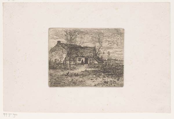 Curator: Arend Boer's "Landschap met boerenhuizen", likely crafted before 1933, presents us with a quiet scene of rural life, rendered as an etching. Editor: Immediately, I’m drawn to the soft, almost hazy quality. It’s as if I’m peering through a rain-streaked window at a memory. The world feels gentle and unhurried. Curator: That softness really speaks to the etching process, doesn’t it? The fine lines, the delicate tonal variations…it captures the stillness you’re sensing. I think Boer is romanticizing laboring, especially when looking into art from this time period. Editor: I agree it is quite romanticized. These workers seems to be walking together at leisure, unlike many harsh depictions of the working class we see represented throughout time. What strikes me most are the contrasts in detail. The figures seem rather indistinct while the thatched roof of the cottage feels incredibly tactile. Curator: A sharp observation! I believe this contrast actually amplifies a sense of closeness. You can relate more to the figures passing by as they represent common humanity and contrast with more mundane dwellings. Editor: So interesting that you are focused on figures, since the genre-scene does not focus on them specifically, so your closeness may be connected to finding people among their scenery. To me the composition positions the dwelling as the focus. I am almost envious for their simple cottage and lifestyle in that moment. Do we know anything more about its context? Curator: While biographical details about Boer are scarce, his work frequently depicts scenes of everyday life, very in line with artistic movements in the Netherlands which prioritized common scenery. One wonders if this piece holds a particular nostalgia, a yearning for simpler times perhaps, considering the tumultuous era in which he worked. Editor: The scarcity of information actually enhances that feeling of a half-remembered past for me. Maybe that's the point. Either way, Boer captured such quiet beauty in the common day, I just keep yearning for my time there! Curator: Absolutely, a simple and peaceful scene that remains universal regardless of personal interpretation.