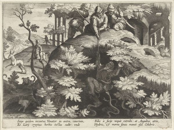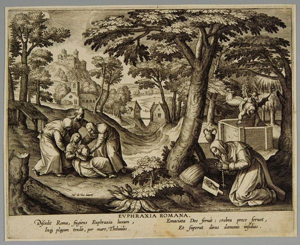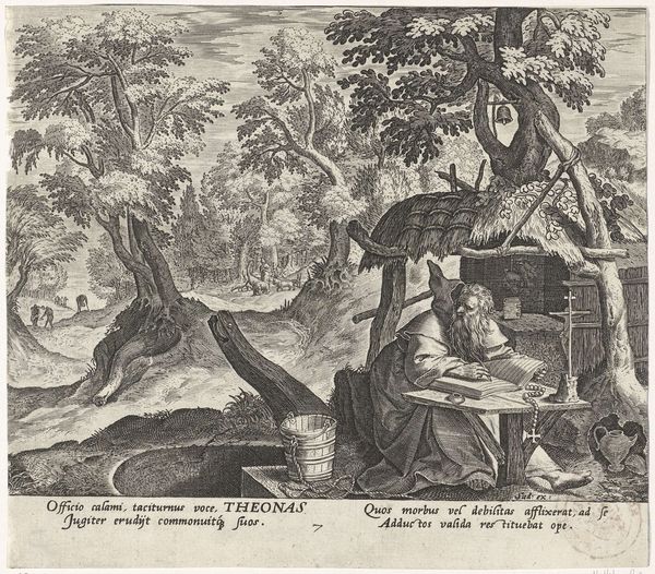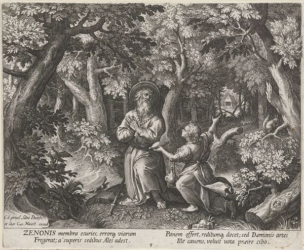 Curator: This etching, "Suatacopius als kluizenaar," was crafted sometime between 1580 and 1625 by Jan van Londerseel, during the Northern Renaissance. At first glance, what are your thoughts? Editor: It’s immediately striking—the texture! You can almost feel the rough paper and see the way the ink settles. And there's something about the light playing within the dense forest that’s really captivating. Curator: Absolutely. The print is from a series of images from the period illustrating transformations of monarchs and important people, showcasing shifts in political or personal circumstances. What are we to make of its engagement with themes like leadership or sacrifice? Editor: The image portrays a man giving up their riches. Note how the line work suggests coarse clothing, simple belongings— the figure renouncing worldly goods, embracing a simpler material existence. How accessible would such a print have been in its time? And how might it influence perceptions of power and the elite? Curator: Interesting point. Printmaking enabled a wider dissemination of ideas, potentially shaping public perception of rulers like Suatacopius. Images like this would enter circulation beyond elite circles. I suspect they contributed to constructing certain narratives about ideal leadership or piety during this turbulent time. Editor: I agree that its wider circulation may bring new ideas to an emerging audience; the mode of production affects meaning here. One more thing, there is a second pair of figures at the top left in the image, these observers provide another perspective on this act, no? What are they doing here? Curator: They could represent the past, those looking to bring him back into power perhaps or they are witnesses of his great sacrifice and abdication. We don't really know, and maybe that is part of its success as an object. Editor: Thanks to its accessible medium we might infer an audience eager for reformation. This image presents clear evidence about shifting values attributed to simplicity. It provides food for thought about society's growing demands upon its leaders! Curator: I appreciate the focus on material processes, the interplay between artist, medium, and intended public enriches our analysis significantly, especially thinking about what these objects meant to various social groups during an important time for religious upheaval and political jockeying.