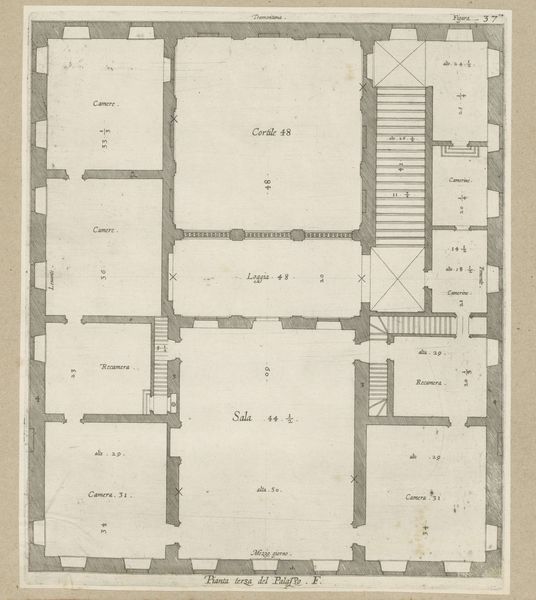 Curator: I find this work remarkably austere. All right angles and clean lines. Editor: Well, let’s dive in. What we’re looking at is a ground plan of the Palazzo Rostan Raggio in Genoa, created in 1622 by Nicolaes Ryckmans. It's currently held at the Rijksmuseum. What interests me most is the labor required to conceive and produce such a complex design by hand. The precise measurements, the inscription. All before the age of digital design! Curator: That's interesting. I am particularly struck by how this architectural drawing represents power, but also invites public interaction and performance. After all, it’s not merely about the walls and rooms, but about how social dynamics shape and are shaped by space. Editor: Exactly. The palazzo was a site of production, trade, and aristocratic display. It's important to look at the materials too. Ink on paper was relatively accessible compared to, say, frescoes, indicating the work might have been widely circulated among artisans. The labor is implicit within those material choices. Curator: Yes. How did the architecture of that period play into that game? Editor: These very geometric shapes reveal the influence of Renaissance ideals, showcasing classical influences which also reflected and affected social aspirations in the culture. Curator: To your point about wider circulation, how was something like this initially used in design and production? Did its use change across the decades? Editor: Originally intended for use as a visual aid in its construction. I imagine in time this very ground plan acted as document to signify how power in Genoa manifested physically, even ideologically. Curator: I hadn't considered that perspective. It really underscores how social and material forces worked hand-in-hand, literally structuring daily existence for everyone that frequented or operated around that space. Editor: Indeed, this modest drawing opens into an exploration of larger social and political histories and questions regarding architectural materiality. Curator: It also offers insight into the social function of art making and patronage during the Renaissance.