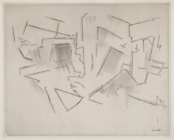 John Marin created this etching, Grain Elevators, Abstraction, in 1917. The monochromatic palette immediately strikes a chord of industrial austerity. The composition teeters between representation and abstraction, inviting us to decode its structural forms. Marin employs a Cubist-influenced fragmentation of space. The grain elevators are not depicted in a traditional, representational manner. Instead, they are broken down into geometric shapes and lines, suggesting a dynamic interplay of volumes. The shading and textures lend a tactile quality to the industrial forms. The artist coaxes a certain lyricism from the utilitarian subject matter. Marin’s strategic deployment of line and form challenges our conventional understanding. The composition isn't just a visual exercise, it reflects a broader cultural engagement with modernity. Here, the artist asks us to reconsider our relationship with the industrialized landscape. The artwork stands as a testament to the enduring power of abstraction.