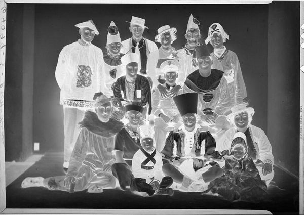 Editor: This is a photographic print, "Untitled (bridal party posed in studio, all men in uniform)" by John Deusing. It's hard to ignore the striking uniformity of the men, it makes me wonder, what do you make of this image? Curator: Well, isn't it a fascinating tableau? The inverted tones give it a ghostly, almost dreamlike quality. I can't help but wonder about the hidden narratives behind those uniforms. It is rather melancholic, isn't it? It makes you question who these people are and what became of them. What do you see? Editor: I agree. It's like a memory, faded and slightly haunting. Curator: Perhaps a memory we're not entirely sure we want to remember. What a poignant story it tells, or rather, hints at! Editor: It definitely gives me a lot to think about, especially the untold stories behind the image. Curator: Precisely! It's that ambiguity, that whisper of a narrative, that really stays with you.