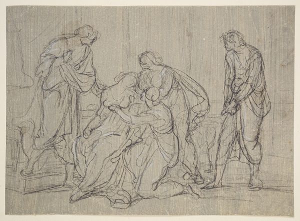 Curator: What strikes me immediately about this work is the raw emotionality. The scene feels heavy, sorrowful. Editor: Indeed. This is "The Entombment" by Jacques Jordaens, created in the 1660s. It's a drawing, executed in ink, watercolor and wash on paper. Currently, it resides in the Rijksmuseum. Curator: The swirling lines amplify that sense of grief. Everyone seems to be either supporting or staring directly in shock, and there is almost this cloud looming over them, adding a lot to that cultural experience of mourning and the iconology around that imagery. It feels both universal and intensely personal. Editor: Precisely. Jordaens lived through periods of immense social and religious upheaval, and these times invariably surface through symbolism. We see this moment – the entombment – repeatedly throughout art history, each version reflecting the society’s values, expectations of grief, and beliefs about mortality. Curator: Look at Mary, front and center, face tilted upwards, eyes closed... there’s such a rich history of Marys in this context, really reflecting ideas about feminine sorrow in the period. The other figures lean inward in compassion, too. Editor: You’re absolutely right. What fascinates me is how the seemingly rushed technique enhances the drama. You wouldn't expect a Baroque master like Jordaens to create such sketch. The loose linework contributes to the overall dynamism, wouldn’t you agree? Curator: Yes, completely. The rapidness almost forces the eye across all of them. Even in the small details of the faces. The symbols around mourning. You know what the piece represents thematically, but the image and rendering really affect how it is perceived. Editor: It also offers us insight into Jordaens' process. Here we see art both as finished product, and documentation of art in progress; a snapshot of artistic creation that allows us to reinterpret this tragic subject in relation to that. I’m truly grateful the Rijksmuseum preserves this artwork for all to view. Curator: It's powerful how even centuries later, a sketch like this can convey such depth and resonate so strongly with us. Editor: Indeed. Art truly functions as both artifact of its own moment, and bridge to our understanding of those lost moments and those yet to come.