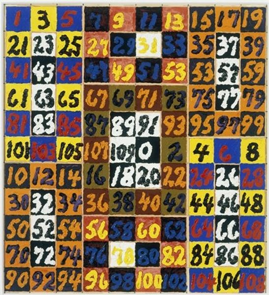 Natalia Dumitresco made this painting, titled "Tout á la joie," using oil on canvas. The bright, bold colors and simple, blocky forms may seem playful, but there's a deeper consideration of process at work here. Dumitresco has created a dense pattern of small squares, each containing what appears to be abstract symbols. These miniature compositions are contained within larger rectangles of color. The repetition suggests a system, maybe even a code, and invites us to consider the act of making as a kind of labor. Each square likely involved a similar set of actions: mixing paint, applying it to the canvas, and defining the image. Dumitresco's method encourages us to think about the relationship between individual effort and larger structures, echoing the repetitive processes often found in industrial production. By focusing on the act of creation itself, the artist pushes us to reconsider the value we place on labor and its relationship to art. It’s a great example of how the material processes and the social context become essential to understanding an artwork's full meaning.