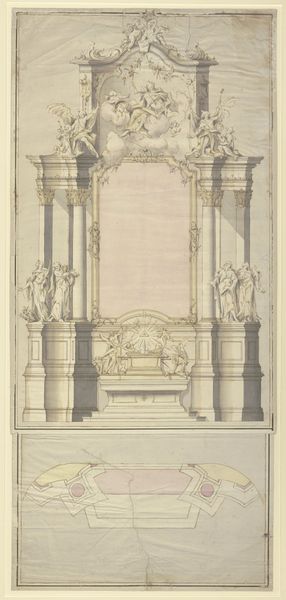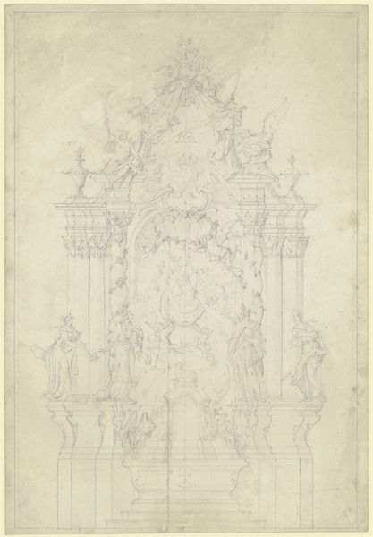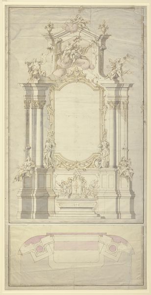 Editor: So, here we have Johann Baptist Straub’s "Sketch of an Altar," from around 1750. It’s a drawing using pencil, ink, and pastel, held at the Städel Museum. It feels very light and airy, almost like a dream. The Baroque and Rococo details are incredible. What do you see in this piece, especially in terms of the imagery? Curator: This sketch serves as a window into the symbolic language of the 18th century. Consider the altar itself, the focal point. It's not just a surface for religious ceremony; it's a stage. What do you notice about the figures surrounding the central void? Editor: Well, there are lots of figures—angels, what look like saints—a very hierarchical structure with the divine above. It's quite theatrical! Curator: Exactly. This "theatricality" carries profound meaning. The altar becomes a conduit, visually connecting the earthly and divine realms. Look at the swarming cherubs, the upward spiraling movement… Can you think about that imagery in relation to period rituals or spiritual beliefs? Editor: It suggests transcendence, or perhaps a pathway for prayers and devotion to ascend. But how would that message resonate today, outside of its original context? Curator: Our perception is colored by time, isn't it? Even if the specific religious context fades, the emotional impact of such a composition persists. The human desire for connection with something larger than ourselves is, I think, timeless. Editor: I hadn’t considered the lasting power of that symbolic yearning. It gives a new perspective to my appreciation of it, even detached from the historical meaning. Curator: And perhaps the sketch itself becomes a symbol then - a memory of faith and artistry. Editor: Thank you! That's a very insightful reading of the artwork.