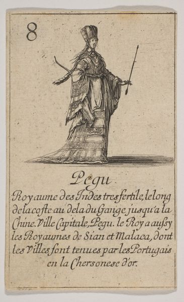 Stefano della Bella created this print, "Grande Bretagne" as part of "Jeu de la Géographie". The engraving presents an allegorical figure representing Great Britain, her identity signaled through emblems of power. Observe how the artist contrasts the figure with the surrounding text, creating a visual hierarchy where the symbolic representation of Great Britain dominates. Notice the figure's elaborate dress and feathered headdress, juxtaposed with the stark simplicity of the shield. The shield, adorned with heraldic lions, anchors the composition. The meticulous lines create texture and depth, especially in the drapery, yet also confine the figure within a structured space. Consider this print not just as an aesthetic object, but as a cultural artifact reflecting early modern European conceptions of nationhood. The controlled lines and deliberate arrangement suggest an effort to define and categorize the world through symbolic representation. This print, therefore, serves as a potent example of how art intersects with early modern cultural and political discourse.