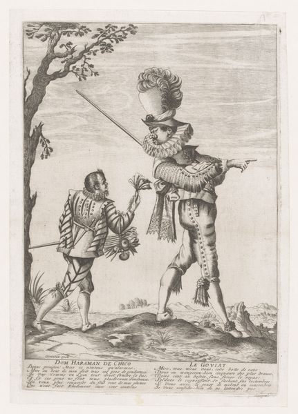 Curator: Let's dive into this etching by Giuseppe Maria Crespi, "Plate 14: Bertoldino cutting off the ears of a gardener's donkey, from "Bertoldo, Bertoldino, and Cacasenno," dating from the early 18th century. What are your initial thoughts? Editor: Well, it's certainly... quirky. There's a small figure, presumably Bertoldino, holding what appears to be a donkey ear, with a very distressed man in the background. It’s a bit absurd, honestly. How do you interpret this work? Curator: Absurdity is key! Consider this within its historical context. Crespi was working in a time when social hierarchies were rigid. The comedic narrative offers a space to question authority, albeit through crude humor. The act of cutting off the donkey's ear—who does that impact, really? Is it about the gardener's property, the donkey's dignity, or perhaps the established order? Editor: That's interesting, I hadn’t considered the power dynamics at play. So, it’s more than just a funny scene? Curator: Precisely. The image engages with class and perhaps speaks to the frustration of those with little social power acting out against the symbols of the relatively more powerful but ultimately still not particularly powerful gardener. What about the way Crespi uses line to depict the figures? Notice the roughness, almost caricature-like quality, especially in Bertoldino himself. Editor: Yes, it makes him look mischievous, but also almost... pathetic? Curator: Exactly. This ambiguity is intentional, creating a complex representation. It's an act of rebellion, yes, but perhaps also a commentary on the consequences and the ethics, or lack thereof, within marginalized communities forced to take drastic action in their struggles with social norms. How might contemporary audiences react to this today? Editor: I think that bringing in current theory offers us some intriguing insights. Considering intersectionality, maybe Bertoldino’s actions can also prompt reflections on the complexities of social justice and moral questions of when “the ends justify the means," or perhaps a call for a broader examination of injustices suffered by marginalized groups who face such stark choices. Curator: Exactly! We must engage with its layered messages rather than just dismissing it as simple jest. Editor: This gives me a lot to think about; it definitely reframed my initial impression!