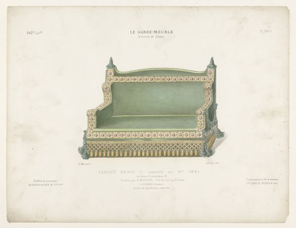Curator: Well, isn't that sofa just begging for a scandal to unfold upon it? So proper and buttoned-up, but underneath… mischief! Editor: Indeed! The image we’re looking at is actually a page from Thomas Sheraton’s "The Cabinet-Maker, Upholsterer and General Artist's Encyclopaedia," dating from between 1804 and 1807. It’s a print, showcasing the Neoclassical style through the clean lines of furniture design. I am really enjoying how decorative and ornamented sofas and furniture from that era used to be! Curator: You can almost hear the hushed whispers and feel the stiff fabrics. The engraving, all those precise lines... it’s beautiful, of course, but also confining, right? Like a social code made visible. Do you think that the drawing perfectly portrays what this particular craftsman intended to be? Editor: Absolutely. But I read the engraving quite differently. While I understand your point, seeing this piece, to me, offers an intimate glance into the lives of the wealthy elite and those who labored, often unseen, to create their status symbols. It speaks volumes about power and inequality. We need to contextualize furniture as more than functional or simply "beautiful," as you said earlier. How does our modern idea of a sofa—mass-produced and affordable to almost anyone—reflect how much social progress has evolved across generations, or hasn’t? Curator: Well, when I think of inequality, I also consider the labor that must have gone into *drawing* this image! To have such a knack to do so. All those precise, repeated motifs—it’s meditative. Like drawing a mandala, a form to perfection... Do you think Sheraton ever felt confined by his own self-imposed perfectionism, like a beautiful gilded cage of his own making? Editor: That's an interesting perspective; one that I hadn't considered, and definitely helps me to think more deeply and appreciate the artistry embedded in it! To really examine the human condition embedded in functional design objects as tools to reveal societal expectations. The level of ornamental sophistication and design principles embedded into creating luxurious, visually pleasing objects can often times lead back to discussions regarding our capitalist, power-fueled motives for the consumer class. Curator: Yes! To view it as functional... with layers of motives from various social contexts. Editor: Precisely. Food for thought, for us all.