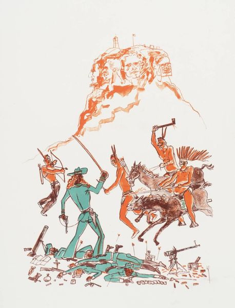 This print by Lovis Corinth captures a violent confrontation between a wolf and a fox with an expressive, gestural style. The composition is a flurry of jagged lines and clashing tones, dominated by earthy browns and reds. The artist's frenzied marks create a sense of chaotic energy. The scene is only loosely defined, with the animals emerging from a dense thicket of marks that suggest a forest. Corinth destabilizes traditional depictions of animal combat through abstraction. We can read a semiotic system of signs in the gestural brushstrokes. They evoke not just the physical struggle, but the raw, untamed aspects of nature and the primal instincts driving these creatures. This abstraction invites us to question the boundaries between representation and expression. The lack of clear narrative details focuses our attention on the formal qualities of the artwork. This transforms a simple scene into an intense visual experience. It also provides a metaphor for broader themes of survival, competition, and the darker side of existence.