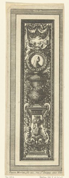 Editor: Here we have "Panel with a Genius Blowing a Trumpet" crafted by Jean Lepautre in 1657. It's a pen drawing. The intricacy is astonishing; all these flourishes seem to spiral upwards, guiding my eye along the panel. What compositional strategies strike you? Curator: The brilliance lies in Lepautre's deployment of line and form. Observe how the verticality is asserted not only by the panel's dimensions but reinforced by the ascending arrangement of motifs: the cherubic figures, the ornate cartouches, and the final exhalation of the trumpet at the apex. Consider also the use of negative space—the stark whiteness allows the complexity of the pen work to truly resonate. Editor: It’s fascinating how the eye is led upwards. It's almost like a visual representation of sound escalating. What would you say is the function of the heavy border in the print, since it creates such a distinct framing effect? Curator: Indeed, the border functions as both a structural element and a visual boundary, serving to contain the exuberance of the central design. This tension between containment and release is integral to understanding the aesthetic impact of the piece. It directs one's focus inwards, prompting careful study of line, texture, and proportion within its delineated space. It’s almost a study of contrasts: chaos contained within order. Do you see how the hatching creates depth? Editor: Now that you mention it, the density of the lines certainly creates a kind of shadowing that brings forth depth and dimensionality to the two-dimensional plane. This reminds me how every element of visual art has a certain weight. Thank you for that enlightening analysis. Curator: It's been my pleasure. Focusing on those formal aspects sharpens our perception and appreciation, doesn't it?