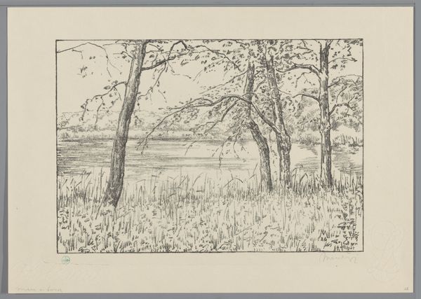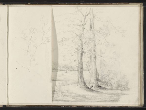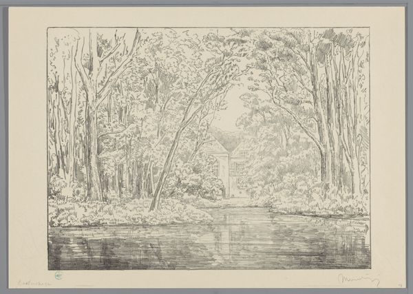 Editor: This is "Gezicht op de Seringenberg op landgoed de Raephorst," a pencil drawing by Simon Moulijn, made between 1925 and 1927. The vista, with its large tree dominating the left side, creates a tranquil mood, yet it also feels a little unbalanced. What compositional elements stand out to you? Curator: Indeed. Observe how the mass of the tree on the left finds a visual echo in the distant, elevated structure. This play of balance and counterpoint invites us to consider how the artist manipulated the interplay between line density and open space. Note, in particular, the layering created with varying line weights which invites the eye to traverse a path to the tower. How does the composition dictate a relationship between foreground, middle ground, and background? Editor: It's interesting how the subtle shading creates depth, even with such a limited palette. What impact does the limited range of tonal values achieve here? Curator: Precisely! It forces a certain distillation of form to its very essence. It directs us to focus intently on how shape and texture, not colour, defines our spatial understanding. This strategic reduction fosters an acute engagement with the visual structure—how do the skeletal branches interact with the trunk? Is the artist making a broader statement about how simple rendering creates powerful suggestion? Editor: That makes sense! So, it’s the intrinsic composition and materiality that communicate the most in this piece. Thanks for that. Curator: My pleasure. It is rewarding to see how a focused approach can unveil layers of visual intent within such a deceptively simple artwork.